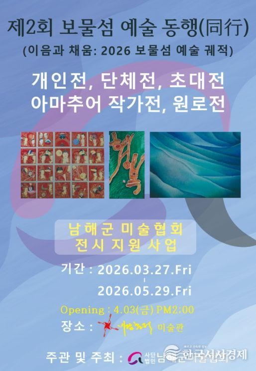남해군 미술협회 이동기 회장은 ”지난해 첫선을 보인 ‘보물섬 예술 동행’이 군민들의 큰 호응을 얻었던 만큼, 올해는 더욱 내실 있는 구성으로 준비했다”며 “13개 팀이 저마다의 색깔로 그려낼 이번 전시가 남해군이 문화예술 도시로 한 단계 더 도약하는 계기가 되길 바란다”라고 말했다.