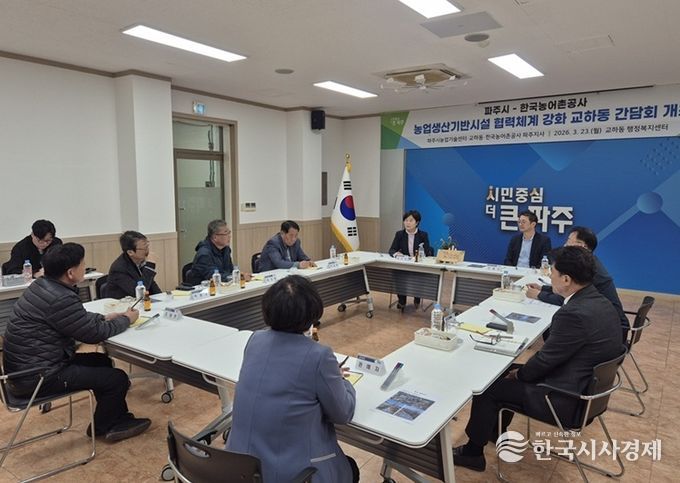 한국시사경제 경기북부취재본부 | 파주시농업기술센터는 지난 23일 교하동 행정복지센터에서 한국농어촌공사 파주지사와 함께 농업생산기반시설의 효율적 관리를 위한 협력 방안을 논의하는 간담회를 개최했다.