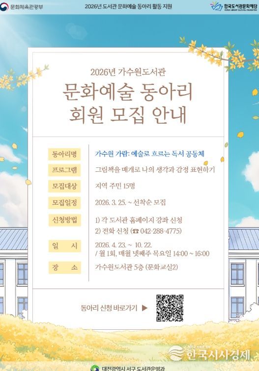 한국시사경제 대전취재본부 | 대전 서구 가수원도서관은 ‘2026년 도서관 문화예술 동아리 활동 지원사업’의 일환으로, 그림책 심리·정서 프로그램 신규 회원을 모집한다고 24일 밝혔다.