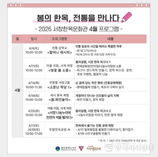 한국시사경제 광주취재본부 | 광주광역시 서구가 도심 속 한옥에서 봄의 정취와 전통문화를 한자리에서 즐길 수 있는 특별한 경험을 선사한다. 서구는 4월 한 달간 서창한옥문화관에서 ‘봄의 한옥, 전통을 만나다’를 주제로 전통문화 프로그램을 운영한다.