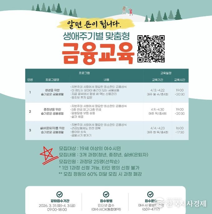 한국시사경제 전남취재본부 | 여수시는 시민들의 금융 이해도 향상을 위해 생애주기별 맞춤형 금융교육 참여자를 모집한다고 밝혔다.