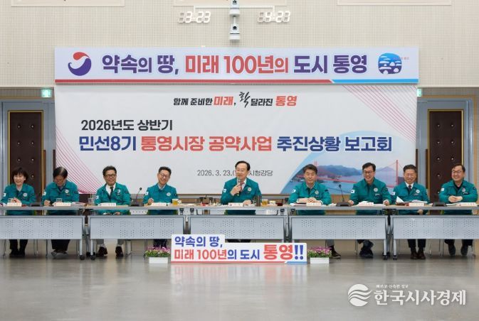 한국시사경제 경남취재본부 | 통영시는 지난 23일 시청 회의실에서 2026년 상반기 민선8기 시장 공약사업 추진상황 보고회를 개최하고, 공약사업 전반에 대한 추진상황과 향후 계획을 점검했다.