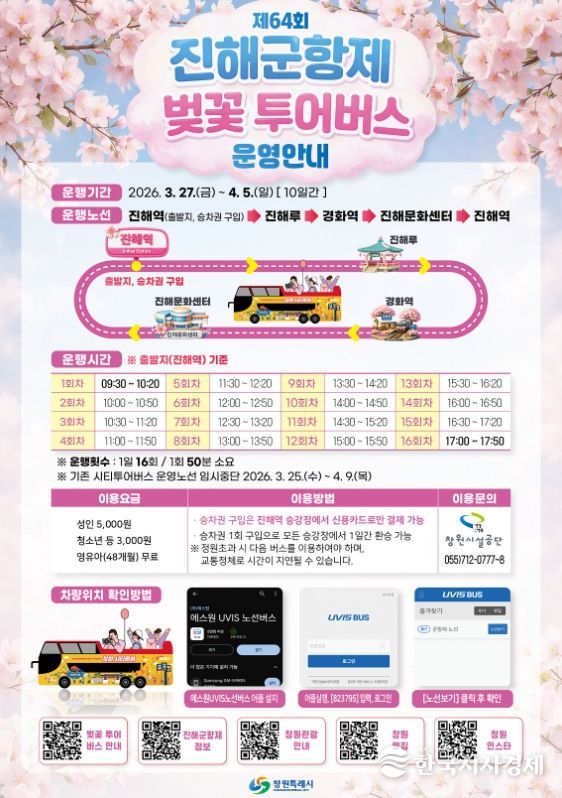 한국시사경제 경남취재본부 | 창원특례시는 오는 3월 27일부터 4월 5일까지 열흘간 제64회 진해군항제와 연계한 ‘벚꽃 투어버스’ 특별 노선을 운영한다.