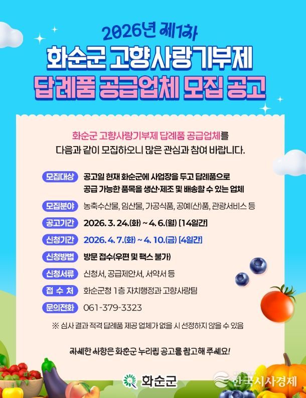 한국시사경제 권충현 기자 | 화순군은 24일 고향사랑기부제 활성화와 기부자 만족도 제고를 위해 2026년 제1차 고향사랑기부제 답례품 및 공급업체를 모집한다고 밝혔다.