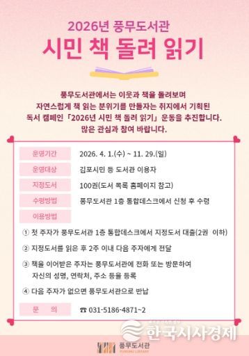한국시사경제 윤광희 기자 | 김포시 풍무도서관은 오는 4월부터 ‘2026년 시민 책 돌려 읽기’ 독서 릴레이를 운영한다.
