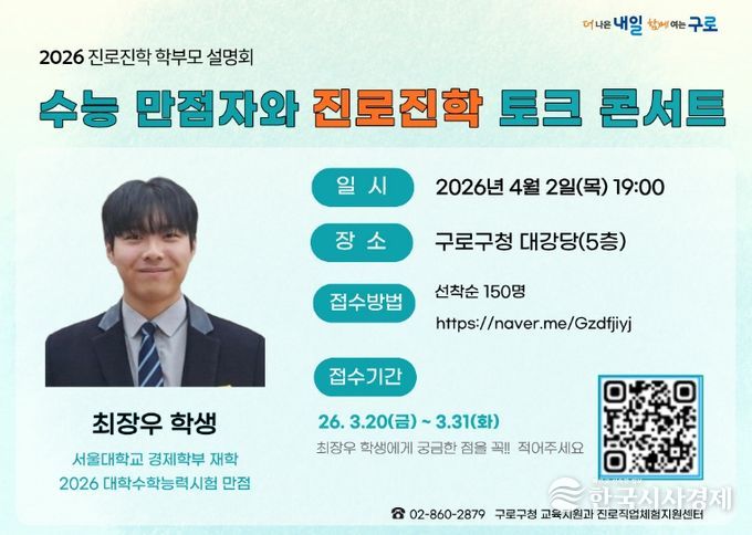 한국시사경제 기동취재팀 | 구로구가 오는 4월 2일 구로구청 대강당에서 ‘2026 수능 만점자와 진로진학 토크콘서트’를 개최한다.