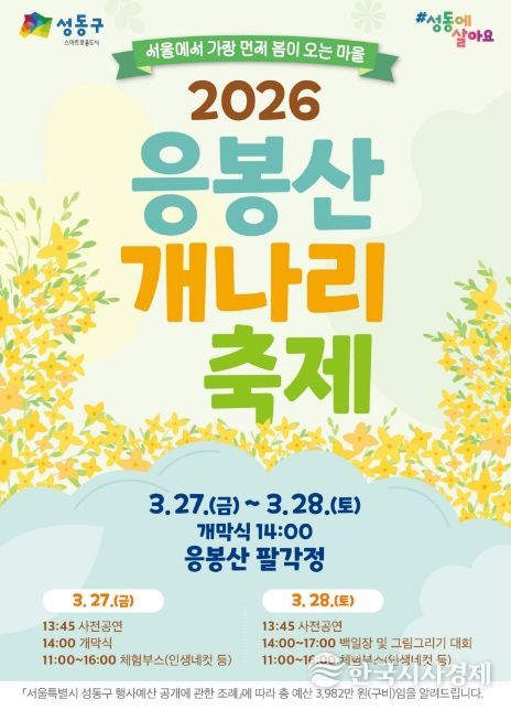 한국시사경제 윤광희 기자 | 서울 성동구는 오는 3월 27일부터 28일까지 이틀간 봄의 기운을 가득 품은 응봉산에서 ‘2026년 응봉산 개나리 축제’를 개최한다.