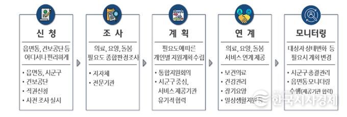 신청이 접수되면 읍면동에서 현장을 직접 방문해 돌봄 필요도를 조사하고 필요한 서비스를 연계하는 체계로 운영된다.