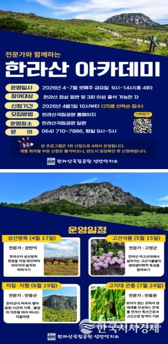상반기 프로그램은 오는 4월 1일 오전 10시부터 한라산국립공원 누리집(홈페이지) ‘프로그램 예약’에서 25명 선착순으로 접수한다. 참여 대상은 한라산 정상 등반이 가능한 체력을 갖추고, 전 과정을 성실히 참여할 수 있는 도민이면 누구나 가능하다.