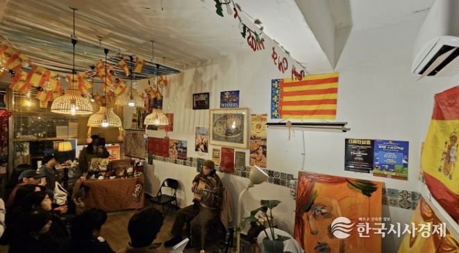 골목에 위치한 작은 가게에는 스페인 국기 가랜드와 FC바르셀로나 팀기, 각종 모임과 공연 포스터, 감각적인 유화작품들이 여기저기 걸려있다. 제멋대로인 듯 일종의 규칙과 문화를 품고 있는 공간을 보고 있노라면 주인장의 정체가 궁금해진다.