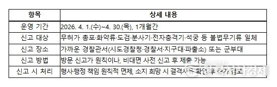 한국시사경제 김숙영 기자 | 경찰청은 불법무기류로 인한 범죄와 사고를 미리 방지하기 위하여 국방부 및 행정안전부와 합동으로 4월 1일부터 30일까지 한 달간 '2026년 1차 불법무기류 자진신고 기간'을 운영한다.