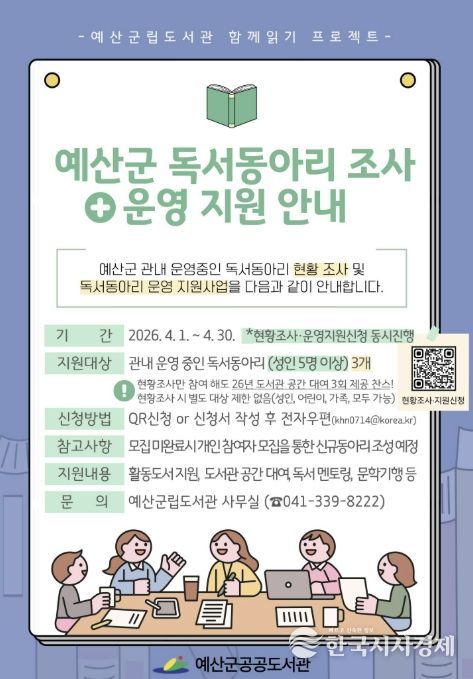 한국시사경제 충남취재본부 | 예산군 공공도서관은 지역 내 독서동아리 활동을 체계적으로 지원하고 독서공동체 기반을 넓히기 위해 ‘2026 독서동아리 운영 지원사업’을 추진한다.