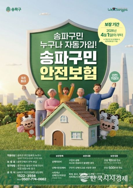 송파구 관계자는 “새롭게 시작하는 구민안전보험이 예기치 못한 사고로 어려움을 겪는 구민에게 도움이 되기를 바란다”며 “앞으로도 구민이 일상에서 안심하고 생활할 수 있도록 촘촘한 사회 안전망 구축에 최선을 다하겠다”라고 전했다.