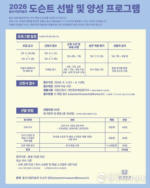 한국시사경제 울산취재본부 | 울산시립미술관은 시민과 함께하는 전시 문화 확산과 미술관 전문해설 인력양성을 위해 ‘2026년 전시해설사(도슨트) 양성 프로그램’ 참여자를 모집한다고 밝혔다.