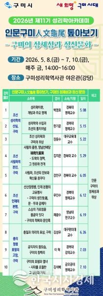 강좌는 5월 8일부터 7월 10일까지 매주 금요일 오후 2시부터 4시까지 운영된다. 박사급 이상 전문 강사를 초빙해 조선성리학의 산실’, ‘조선사림파의 본산’, ‘조선인재의 본향’, ‘충의·청렴·효열의 표상’ 등 구미가 지닌 인문적 가치를 다각도로 조명한다. 이를 통해 15세기 이후 이어온 인문도시로서의 위상을 재확인하고, 시민들의 자긍심을 높이는 데 초점을 맞췄다.