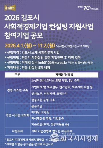 한국시사경제 기동취재팀 | 김포시가 관내 사회적경제기업의 지속 가능한 성장과 자생력 강화를 위해 ‘사회적경제기업 역량강화 컨설팅 지원사업’ 참여기업을 오는 11월까지 수시 모집한다.