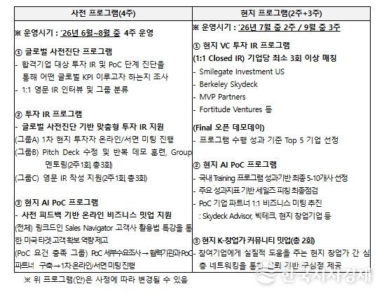 둘째, 선정된 기업에게는 글로벌 진출에 필요한 약 8,000만 원의 진출 자금과 미국에서 진행하는 5주 가량의 현지 프로그램(붙임2), AI 제품 및 서비스의 기술력을 검증하는 해외 실증(Proof of Concept), 최소 3회 이상의 현지 투자 IR(Investor Relations) 참여 기회 등이 주어진다.