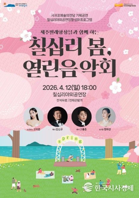 한국시사경제 노승선 기자 | 서귀포예술의전당은 칠십리야외공연장 활성화 프로그램의 일환으로, 4월 12일 오후 6시 칠십리야외공연장에서 제주빌레앙상블과 함께하는 ‘칠십리 봄, 열린음악회’를 개최한다.