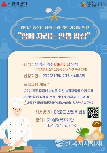 한국시사경제 이정이 기자 | 영덕복지재단(이사장 김명용)은 관내 중장년 1인 가구 남성들의 건강한 자립을 지원하기 위해 식생활 교육 프로그램 ‘함께 차리는 인생 밥상’의 참여자를 다음 달 3일까지 모집한다.