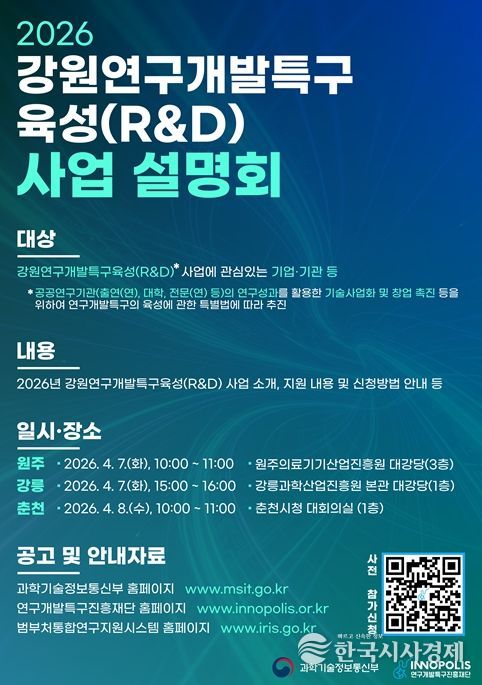 한국시사경제 경제팀 | 연구개발특구진흥재단과 강원특별자치도는 ‘2026년 강원연구개발특구육성(R·D) 사업 설명회’를 4월 7일 원주·강릉, 8일 춘천에서 개최한다고 밝혔다.