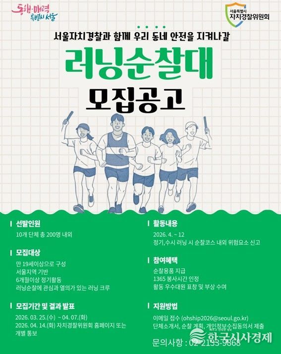 한국시사경제 김숙영 기자 | 서울시 자치경찰위원회는 러닝을 하며 동네 안전까지 함께 살피는 시민 참여형 활동인 서울 러닝 순찰대에 참여할 2026년 신규 대원을 모집한다. 올해는 10개 단체(크루) 200명 규모로 확대해 운영할 계획이다.
