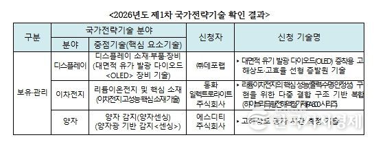 한국시사경제 디지털 뉴스팀 | 과학기술정보통신부와 한국과학기술기획평가원(원장 직무대행 황지호,)은 ‘2026년도 제1차 국가전략기술 확인 신청’에 대해 총 3건의 기술(디스플레이, 이차전지, 양자 분야)이 국가전략기술에 해당하는 것으로 확인했다.