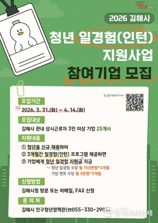 한국시사경제 경제팀 | 김해시는 미취업 청년에게 기업 직무 경험 기회를 제공하는 청년 일경험(인턴) 지원사업 참여기업을 모집한다고 1일 밝혔다.