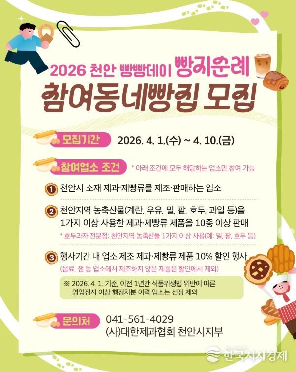 한국시사경제 충남취재본부 | 천안시가 오는 6월 열리는 ‘2026 빵지순례 빵빵데이’에 참여할 역량 있는 동네 빵집을 공개 모집한다고 1일 밝혔다.