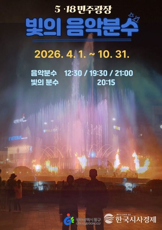 동구 관계자는 “5·18민주광장 빛의 음악분수는 시민들이 일상 속에서 문화와 휴식을 함께 즐길 수 있는 도심 속 명소”라며 “앞으로도 다양한 연출과 콘텐츠를 지속적으로 발굴해 시민들에게 더욱 풍성한 볼거리와 즐길 거리를 제공하겠다”고 말했다.