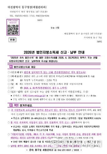 한국시사경제 대전취재본부 | 대전 동구는 법인세 납세의무가 있는 12월 결산법인을 대상으로 오는 30일까지 법인지방소득세 집중 신고기간을 운영한다고 1일 밝혔다.