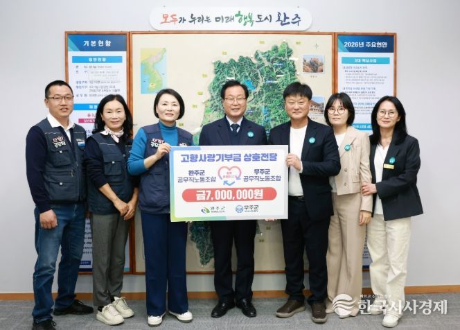 한국시사경제 김숙영 기자 | 완주군 공무직 노동조합(위원장 김상곤)과 무주군 공무직 노동조합(지부장 오순덕)이 서로의 지역 발전을 응원하며 고향 사랑 기부금을 상호 기부하는 뜻깊은 자리를 마련했다.
