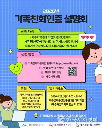 한국시사경제 노승선 기자 | 제주특별자치도와 제주여성가족연구원 제주가족친화지원센터는 2026년 가족친화인증 신규 및 재인증 신청 접수에 따라 도내 기업(관)을 대상으로 가족친화인증 설명회를 개최한다.