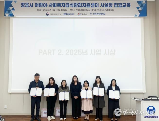 한국시사경제 전북취재본부 | 정읍시 어린이·사회복지급식관리지원센터가 지난달 31일 전북과학대학교 하이브(HIVE)센터에서 관내 어린이 급식소 시설장 90여 명을 대상으로 ‘2026년 사업설명회 및 어린이 식생활 교육’을 개최했다.