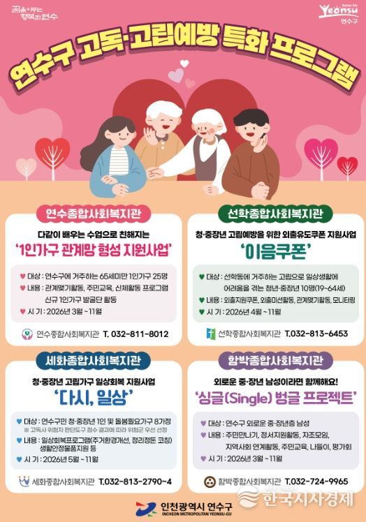 한국시사경제 문화팀 | 연수구가 사회적 고립 가구의 일상을 살피고 지역사회 복귀를 돕기 위해 지역 내 종합사회복지관 4곳과 함께 ‘2026년 고독·고립 예방 특화사업’을 본격적으로 추진한다.