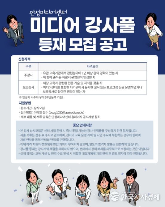 한국시사경제 경기취재본부 | 안성시는 4월 1일부터 보다 체계적이고 전문적인 미디어 교육 운영을 위해 ‘미디어 강사풀’ 등재 강사를 상시 모집한다.