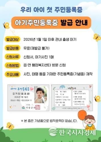 한국시사경제 경남취재본부 | 거창군은 소중한 아기의 출생을 기념하고 출산 장려를 위한 사회적 분위기를 조성하기 위해, 지난 2025년부터 시행 중인 ‘아기 주민등록증’ 무료 발급 서비스를 올해도 지속 추진하고 있다.