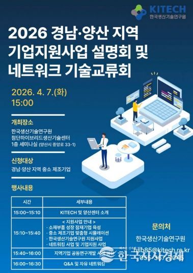 한국시사경제 노승선 기자 | 양산시는 오는 7일 한국생산기술연구원 첨단하이브리드생산기술센터 세미나실에서 지역 산업 발전 촉진과 관내 제조기업의 기술 혁신을 도모하기 위해 ‘2026년 기업지원사업 설명회 및 네트워크 기술교류회’를 개최한다고 밝혔다.