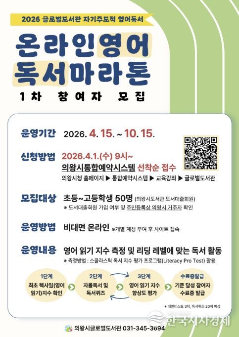한국시사경제 권충현 기자 | 의왕시 글로벌도서관은 학생들의 영어 독서 흥미를 높이고 자기주도적 학습 습관 형성을 지원하기 위해 기획된 '온라인 영어독서마라톤'의 1차 참여자 50명을 모집하고 있다.