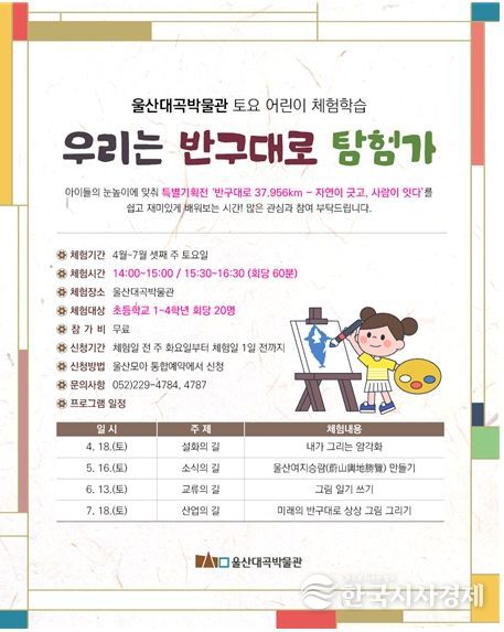 한국시사경제 울산취재본부 | 울산대곡박물관은 어린이 관람객을 대상으로 한 체험학습 ‘우리는 반구대로 탐험가’를 4월부터 7월까지 매월 셋째 주 토요일에 운영한다고 밝혔다.