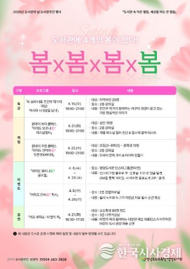 한국시사경제 경북취재본부 | 경상북도교육청 영양도서관은 2026년 도서관의 날·도서관주간을 맞아 ‘도서관 속 작은 펼침, 세상을 여는 큰 열림’을 공식 표어로 지역주민을 위한 강연, 체험, 공연, 이벤트를 운영한다.