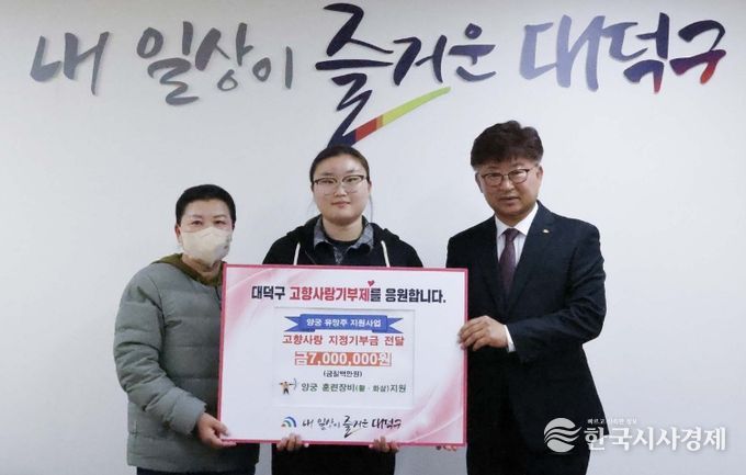 한국시사경제 대전취재본부 | 대전 대덕구는 6일 고향사랑기부제 지정기부사업으로 모금된 기부금을 지역 청소년 양궁 유망주에게 전달했다.