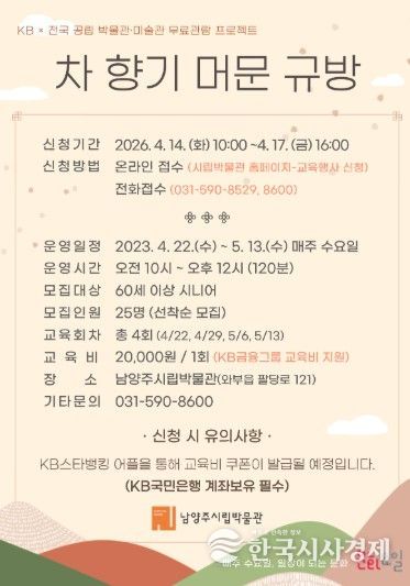한국시사경제 기동취재팀 | 남양주시는 오는 22일부터 남양주시립박물관이 시니어 대상 체험 프로그램 ‘차 향기 머문 규방’ 운영하고, 이에 앞서 14일부터 참여 신청을 받는다고 7일 밝혔다.