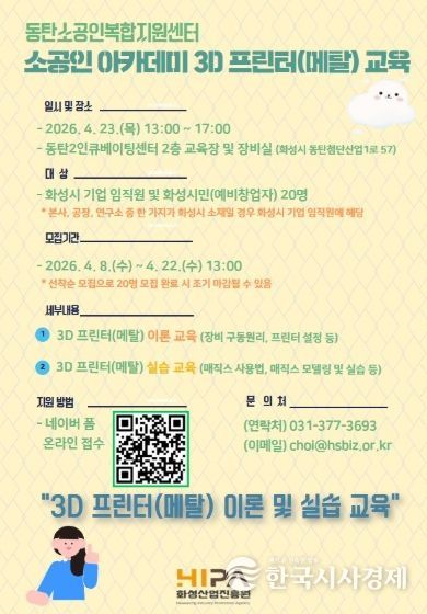 1회차 교육은 4월 23일 동탄 소공인복합지원센터에서 운영되며, ▲3D 프린터(메탈) ▲ 매직스 및 전처리 등의 주제로 이론과 실습을 병행해 수강생들의 현업 적용을 지원할 예정이다.
