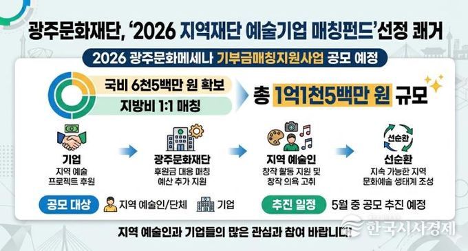 한국시사경제 광주취재본부 | 광주문화재단은 한국문화예술위원회가 주관하는 ‘2026년 지역재단 예술기업 매칭펀드 지원사업’ 공모에 최종 선정돼 국비 6천5백만 원을 확보했다고 밝혔다.