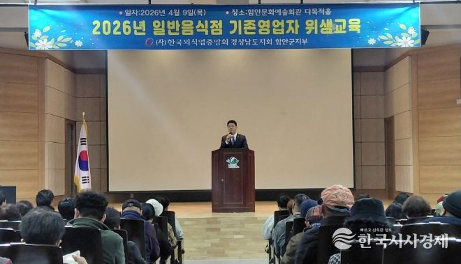 한국시사경제 경남취재본부 | 함안군은 지난 9일부터 10일까지 이틀간 함안문화예술회관과 칠원읍사무소에서 관내 일반음식점 영업자 300여 명을 대상으로 ‘2026년도 기존 영업자 식품 위생교육’을 실시했다고 밝혔다.