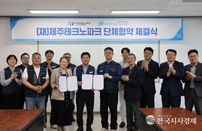 제주TP는 8일 오후 제주벤처마루에서 지영흔 제주TP 원장과 최연택 공공과학기술연구노동조합 위원장 등 노사 관계자들이 참석한 가운데 단체협약 체결식을 진행했다고 밝혔다.