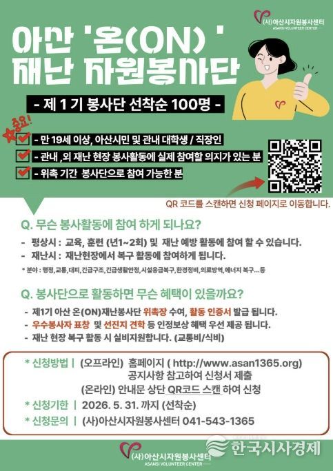 한국시사경제 충남취재본부 | 아산시는 5월 31일까지 ‘제1기 아산 온(ON) 재난봉사단’에 참여할 자원봉사자 100명을 모집한다고 밝혔다.