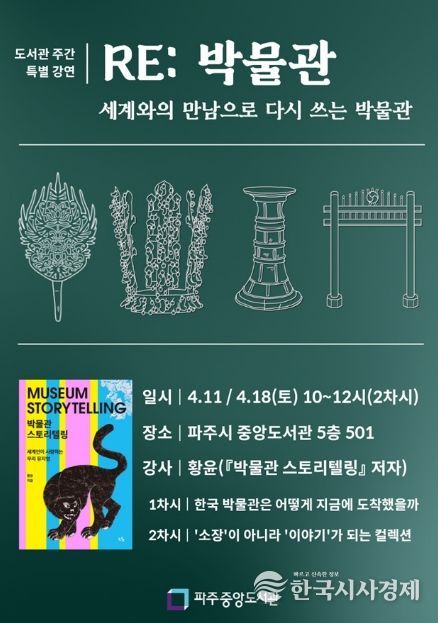 한국시사경제 경기북부취재본부 | 파주중앙도서관은 도서관 주간을 맞아 오는 4월 11일과 18일 토요일 10시, 특별 강연 ‘리(RE): 박물관-세계와의 만남으로 다시 쓰는 박물관’을 운영한다.