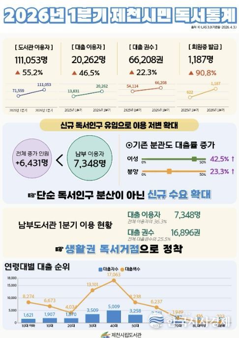 한국시사경제 충북취재본부 | 제천시립도서관이 2026년 1분기 시민 독서 이용 현황을 집계한 결과, 도서관 방문과 대출, 회원 등록이 전반적으로 증가하며 지역 독서 기반이 확대된 것으로 나타났다.