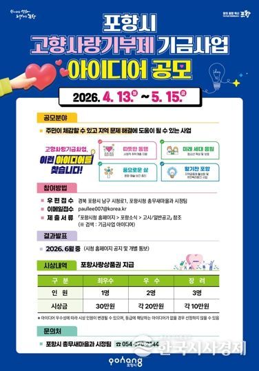 한국시사경제 노승선 기자 | 포항시가 기부자의 소중한 마음을 지역의 희망으로 전환하기 위해 ‘2026년 포항시 고향사랑기부제 기금사업 아이디어’를 공개 모집한다.